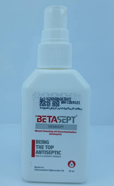محلول ضدعفونی کننده بتاسپت دارای ترکیبی حاوی کلرهگزیدین دی گلوکونات 1 درصد می باشد. محلول بتاسپت به عنوان آنتی سپتیک موثر بر بهبود زخم ها و محل پانسمان به شمار می رود و توسط منابع مختلف و مطالعات علمی مورد تاکید قرار گرفته است این محلول در بسته 50 میل عرضه میشود