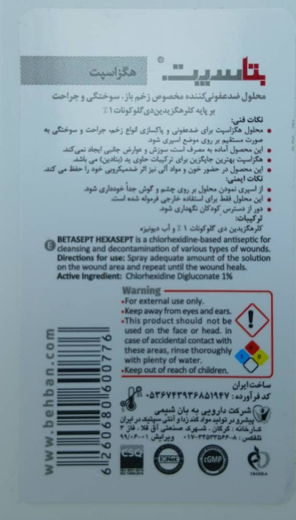 دارای مجوز رسمی از سازمان غذا و دارو حاوی 1 درصد کلرهگزیدین دی گلوکونات و دارای اثر ضد میکروبی قدرتمند دارای اثرات پایدار ضد میکروبی به دلیل خاصیت Substantivity ماده کلرهگزیدین مناسب برای پانسمان زخم، جراحت و سوختگی ها بهترین جایگزین برای محصولات حاوی ید دستورالعمل مصرف: ناحیه مورد نظر را تمیز کنید. محلول بتاسپت را بصورت مستقیم از فاصله نزدیک (5 سانتی متر) بر روی موضع اسپری نمایید.